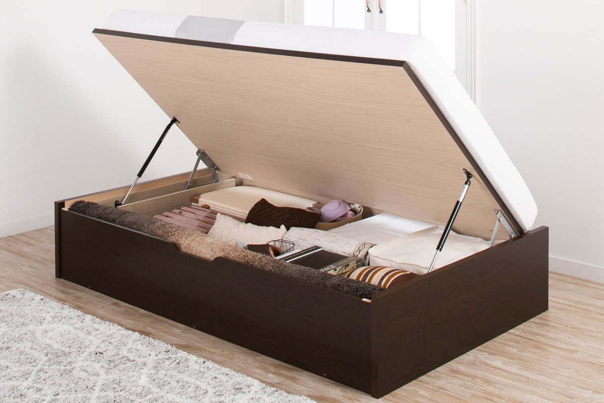 安心の日本製シリンダーを使用したガス圧式収納ベッドは、重量のある床板がマットを敷いたまま開閉できます。床板が大きく開くため、季節もののアイテムやじゅうたん、カーペットなどの長物、スーツケースなどの大型アイテムがラクに収納できます。シリンダー部分はガード付きで、収納物を挟む心配もございません。